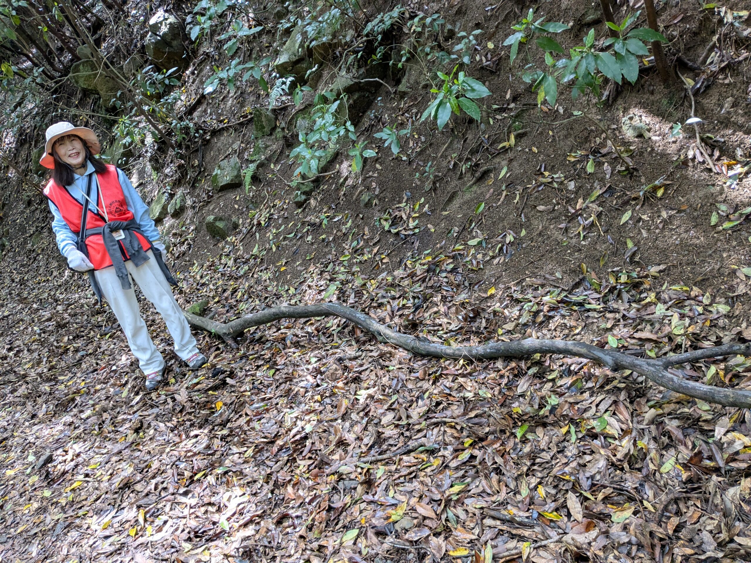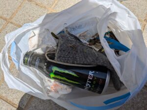 タバコの吸殻、手袋、ペットボトルなどを回収処理しました。 山頂のNHKテレビ塔の裏側に大きな発泡スチロールの破片がありました。 権現周回路の途中に枝が折れて蔓に絡まっていたので、引っ張って取り除きました。