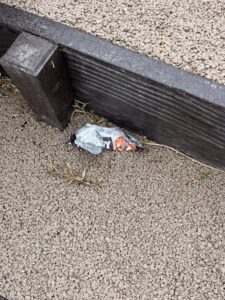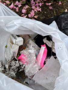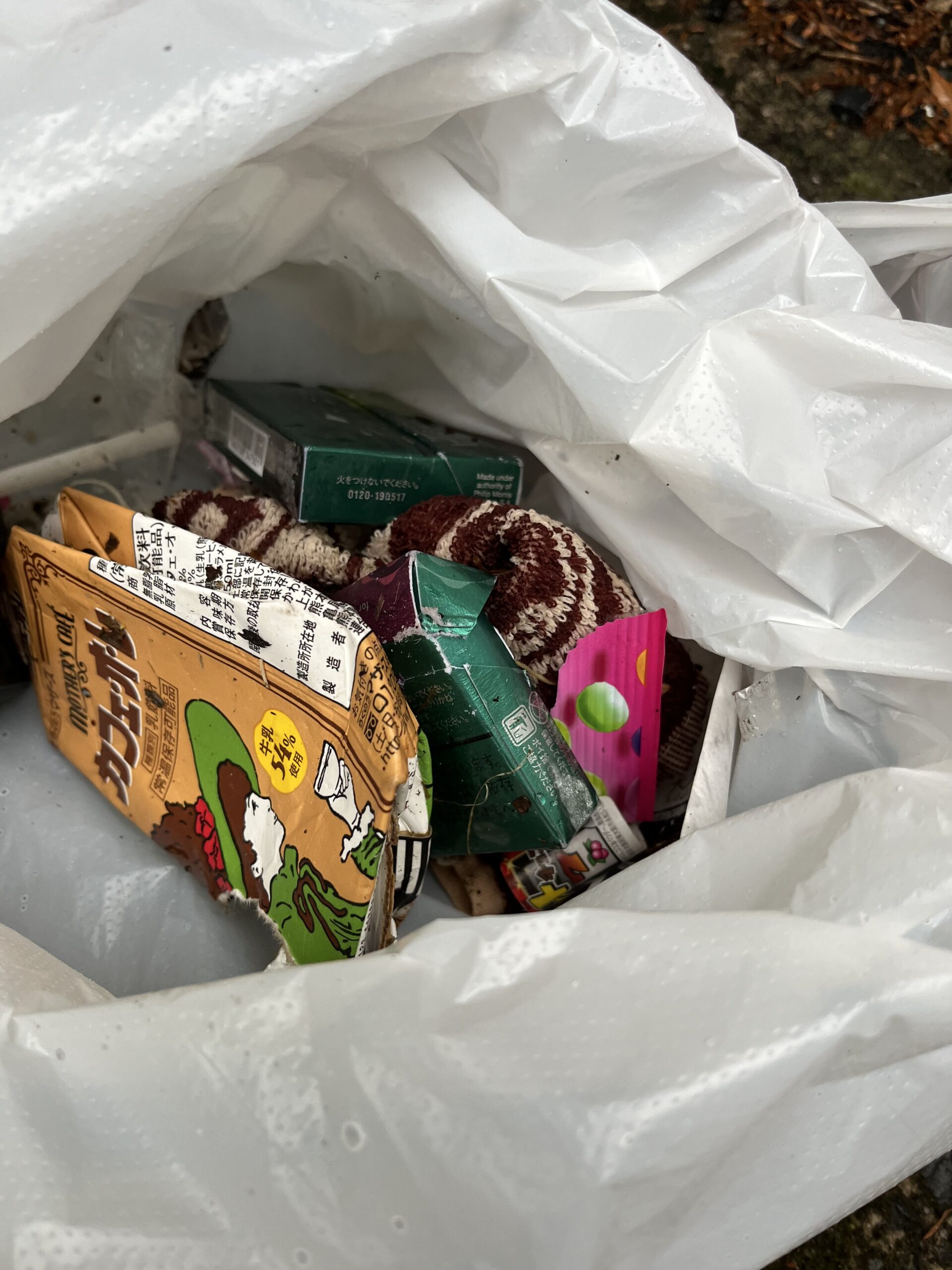 タバコの空箱、吸い殻、ティッシュ、菓子袋などのゴミが多数ありました。